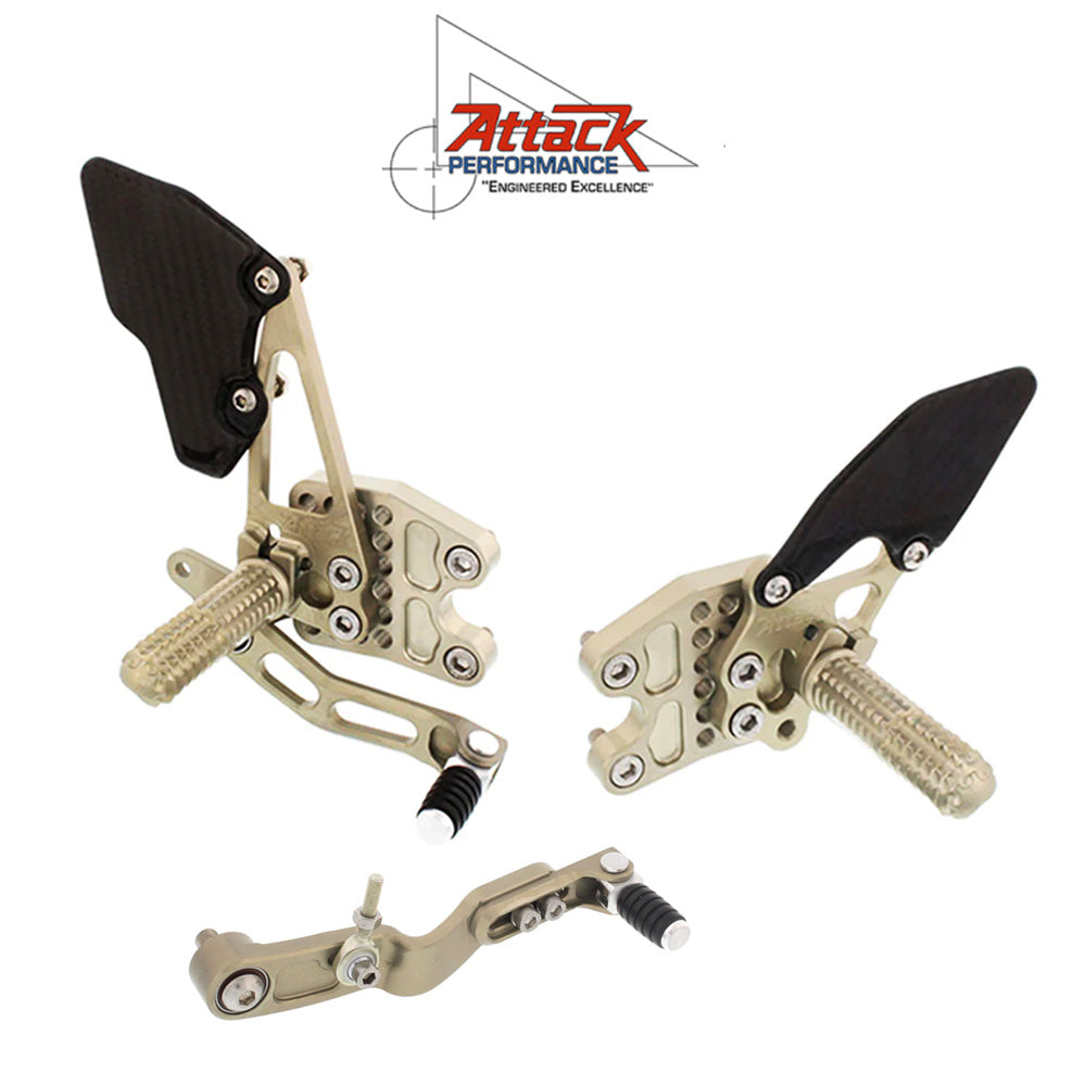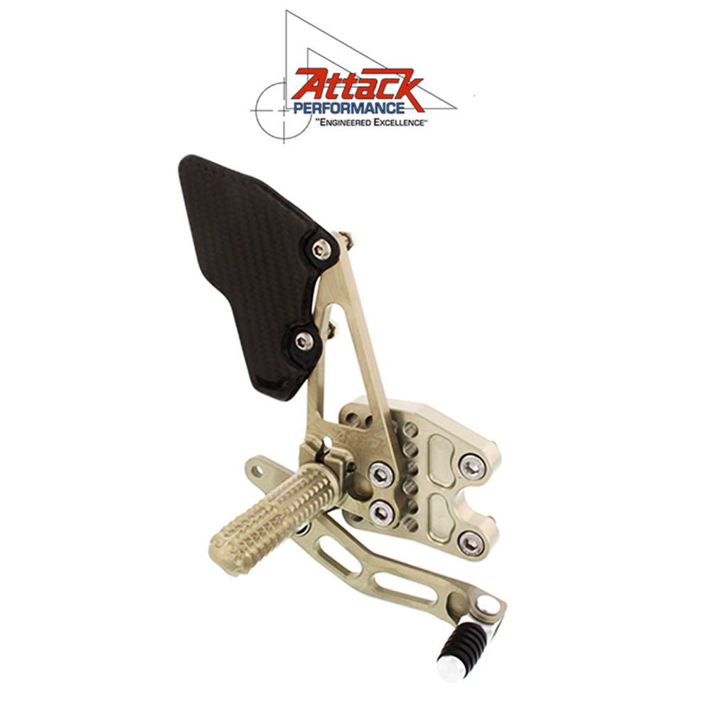 アタックパフォーマンスのアセットは数十年にわたる最先端のエンジニアリングソフトウェアの経験を活かして開発された、軽量で丈夫なコンポーネントから作られています。このキットは標準シフトと GP シフトの両方に対応しており追加パーツは必要ありません。バイクのエルゴノミクスを個人のライディングスタイルに合わせることは、ラップタイムを向上させるための重要な要素です。リアセットに驚異的な調整機能を組み込み、フットペグと両方のペダルの位置を広範囲に調整できるようにしました。また、シフトロッドの下部ハイムジョイント用の 3 つの取り付けポイントがあり、フレームのシフトセンサーのための適切なクリアランスを維持しながら、ロッドの角度が適切になるようにします。