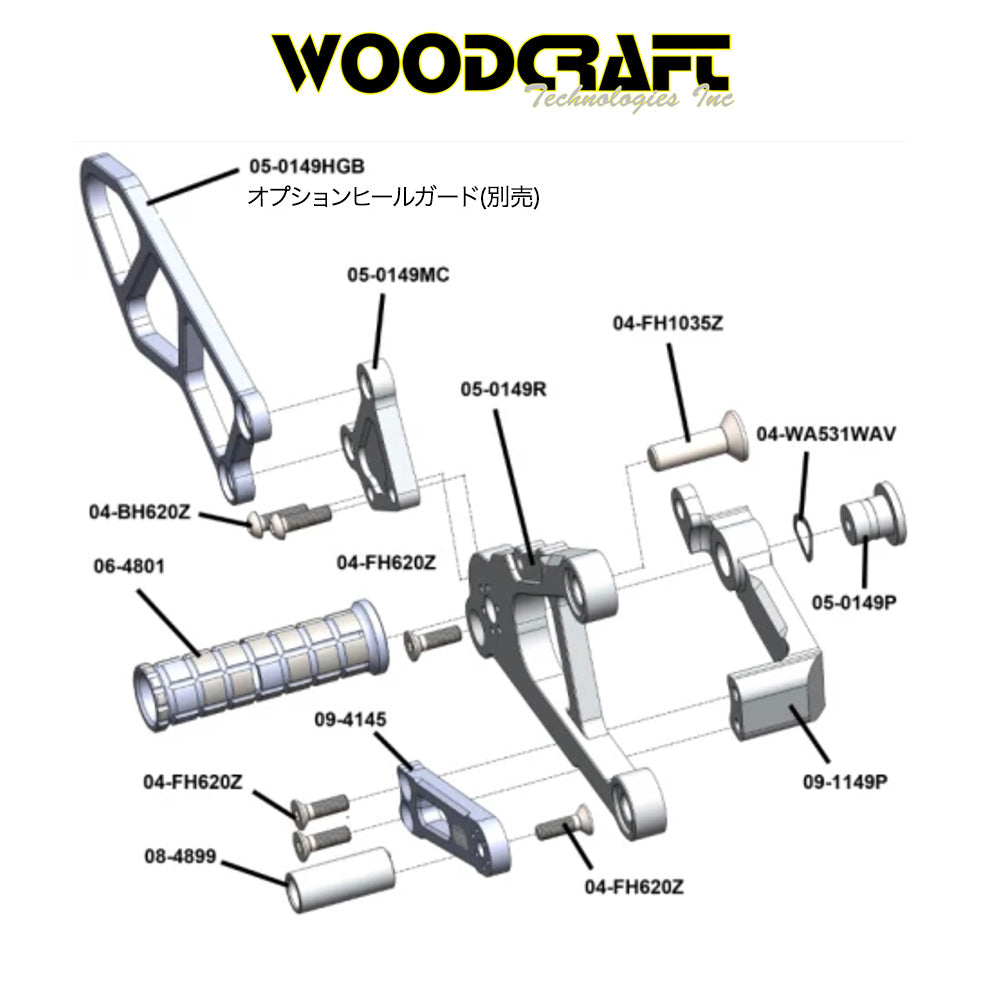 2019-2025年式 カワサキ Ninja ZX-6R用 ウッドクラフト製 スタンダード/GPシフト リアセット Woodcraft 05-0151B Kawasaki ZX636 Complete Rearset Kit - STD/GP Shift (消費税、送料込み)